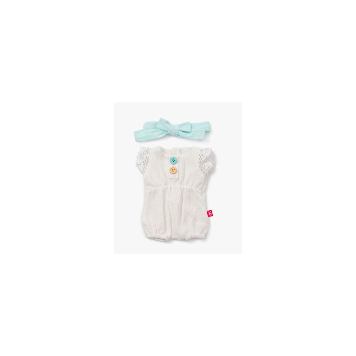 Conjunto ibicenco tipo body para muñecos de 38 cm, con diseño blanco, botones y lazo turquesa. Cómodo, práctico y perfecto para su vestuario.