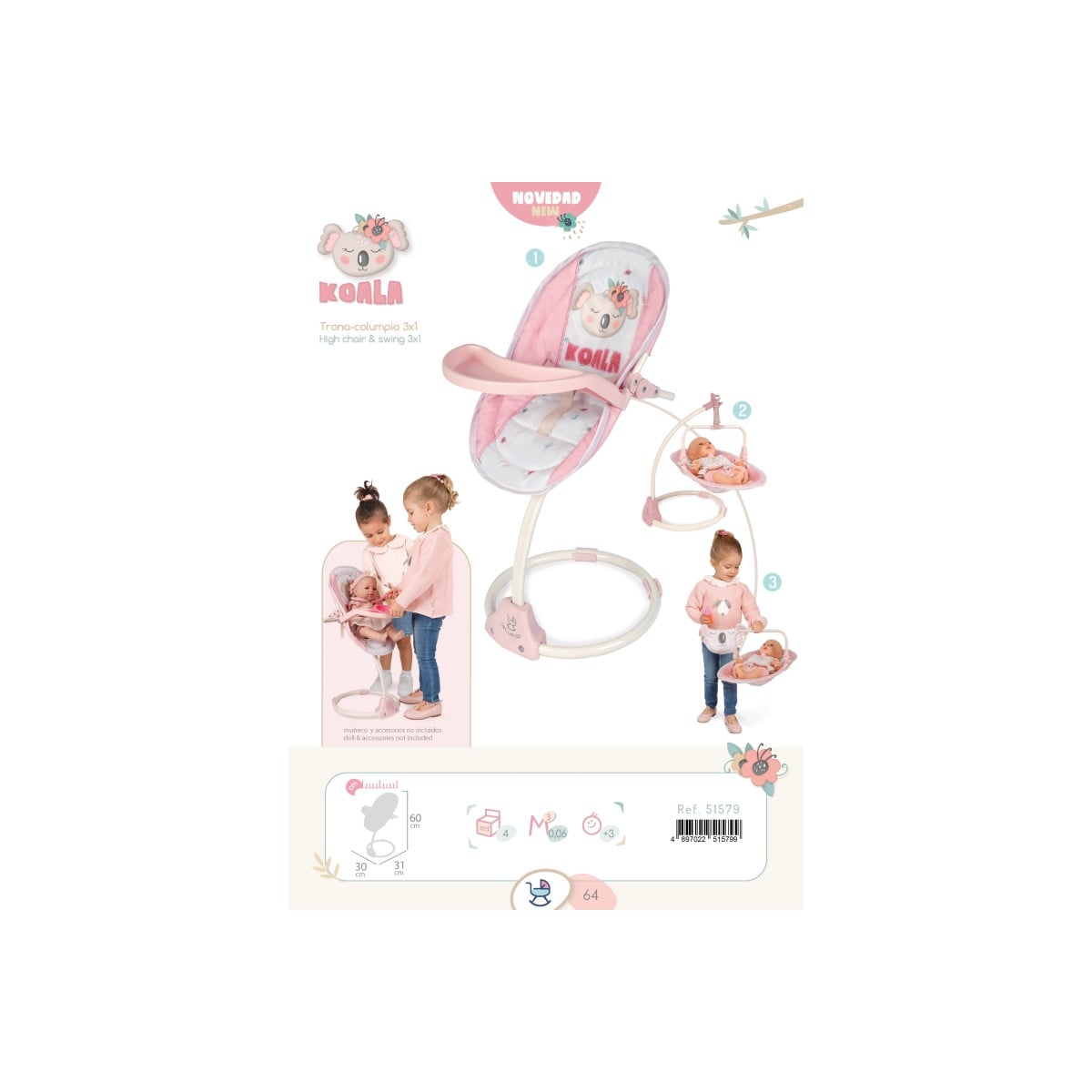 El diseño de la Trona Columpio 3x1 destaca por su estética elegante y moderna, con un tema de koala que añade un toque adorable. La estructura está hecha de materiales duraderos y seguros, asegurando que pueda soportar horas de juego activo. Como trona, permite a los niños "alimentar" a sus muñecas, recreando la hora de la comida de manera realista. El columpio, por otro lado, proporciona un elemento de diversión adicional, permitiendo a los pequeños balancear suavemente a sus muñecas. Finalmente, como silla, ofrece un lugar cómodo para que las muñecas "descansen" después de jugar.