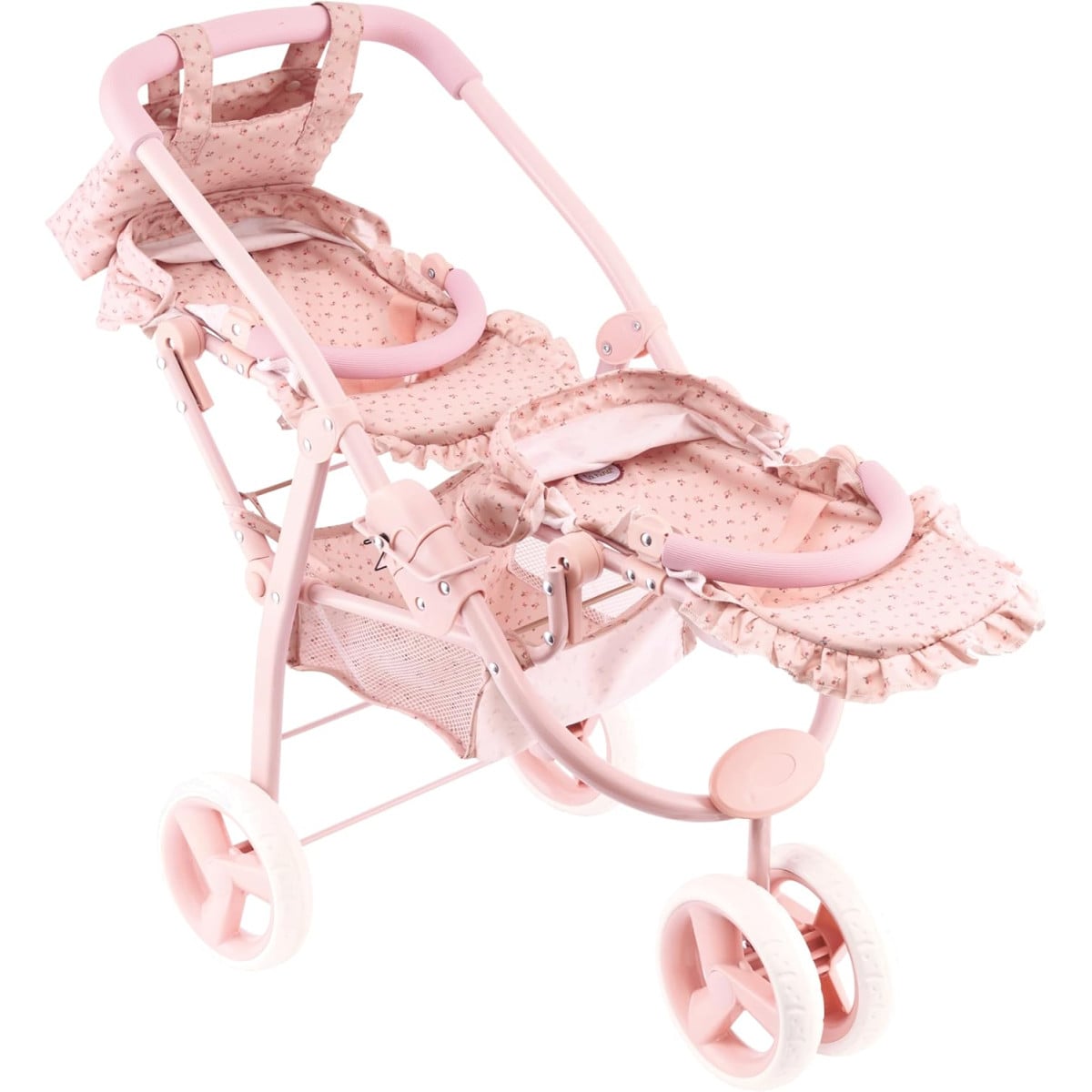Carro gemelar para muñecas plegable y resistente, con dos asientos y cesta inferior. Ideal para muñecos de 30 a 42 cm y fomentar el juego simbólico.