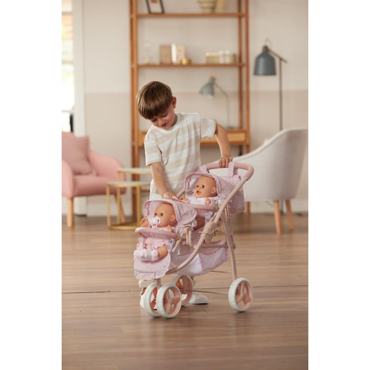 El carro gemelar Olivia de La Nina es el accesorio perfecto para que los niños y niñas disfruten del juego de imitación cuidando y paseando a sus muñecas como auténticos papás y mamás. Diseñado para llevar dos muñecos a la vez, este cochecito doble permite recrear situaciones reales y multiplicar las posibilidades de juego.