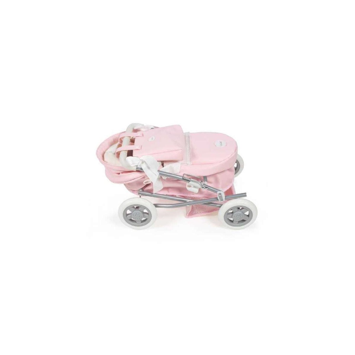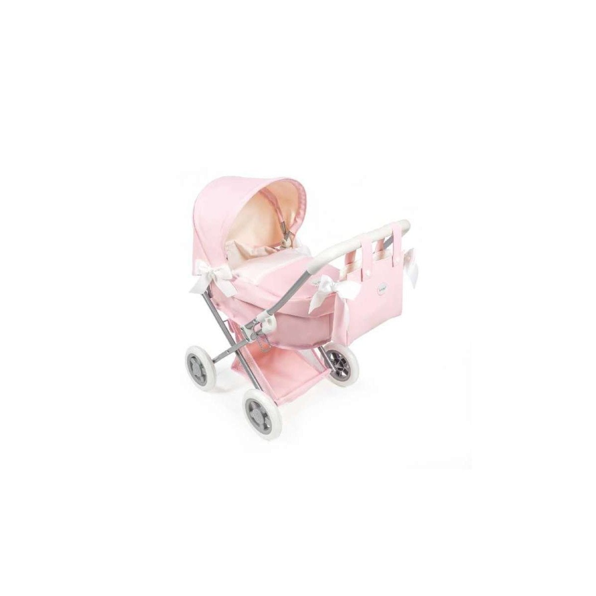 Un cochecito de charol para muñecos bebé de La Nina. Es perfecto para que los peques lleven a sus bebés, de entre 36 y 52 cm, por ahí de paseo. Tiene las mismas funcionalidades que uno de verdad, ya que se se pliega e incluye capota, bolsa y cesta. Además, destaca su exquisito diseño rosa y blanco en charol con lazos de tul.