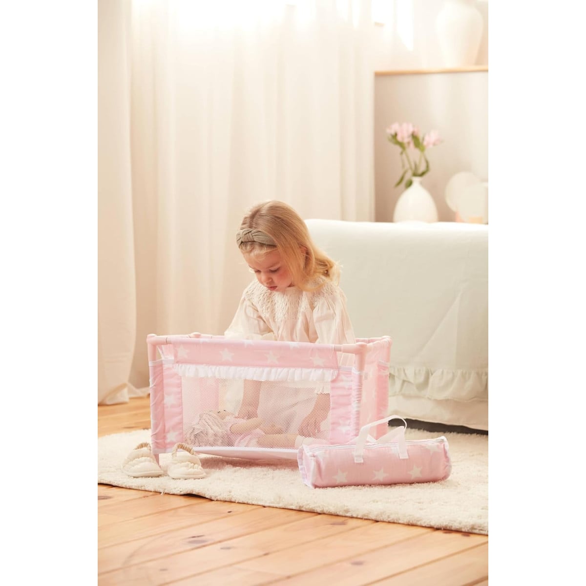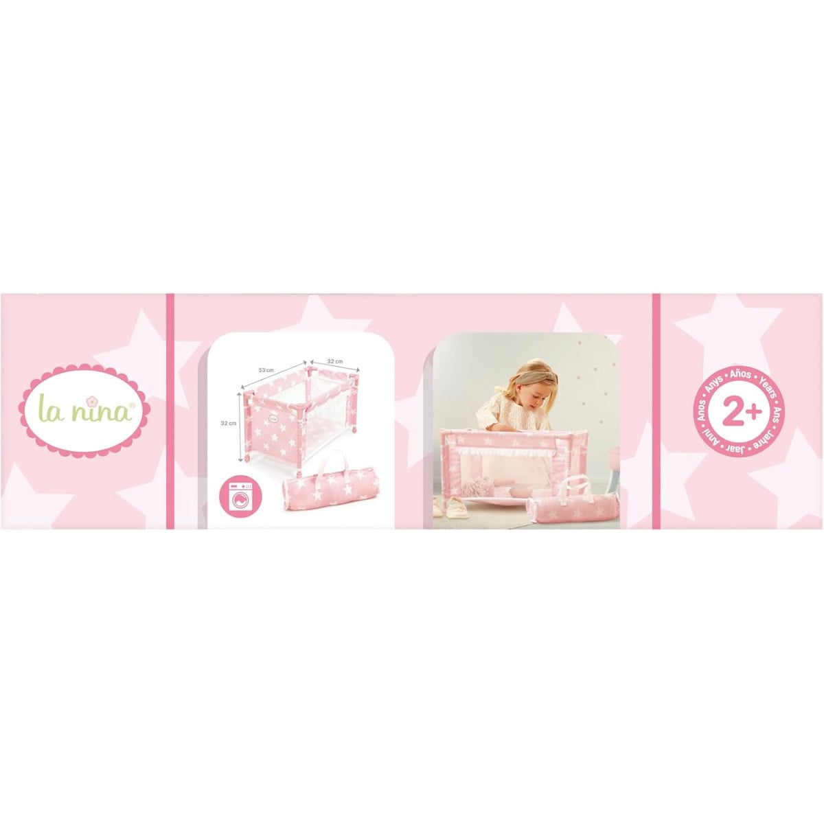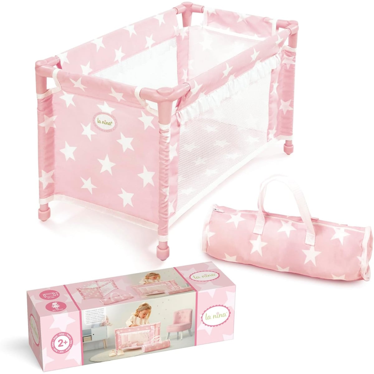 La cuna de viaje Carlota de La Nina es un complemento ideal dentro de las sillas y carritos para muñecas, perfecta para que los peques puedan cuidar a sus bebés de juguete también a la hora de dormir, tanto en casa como fuera.