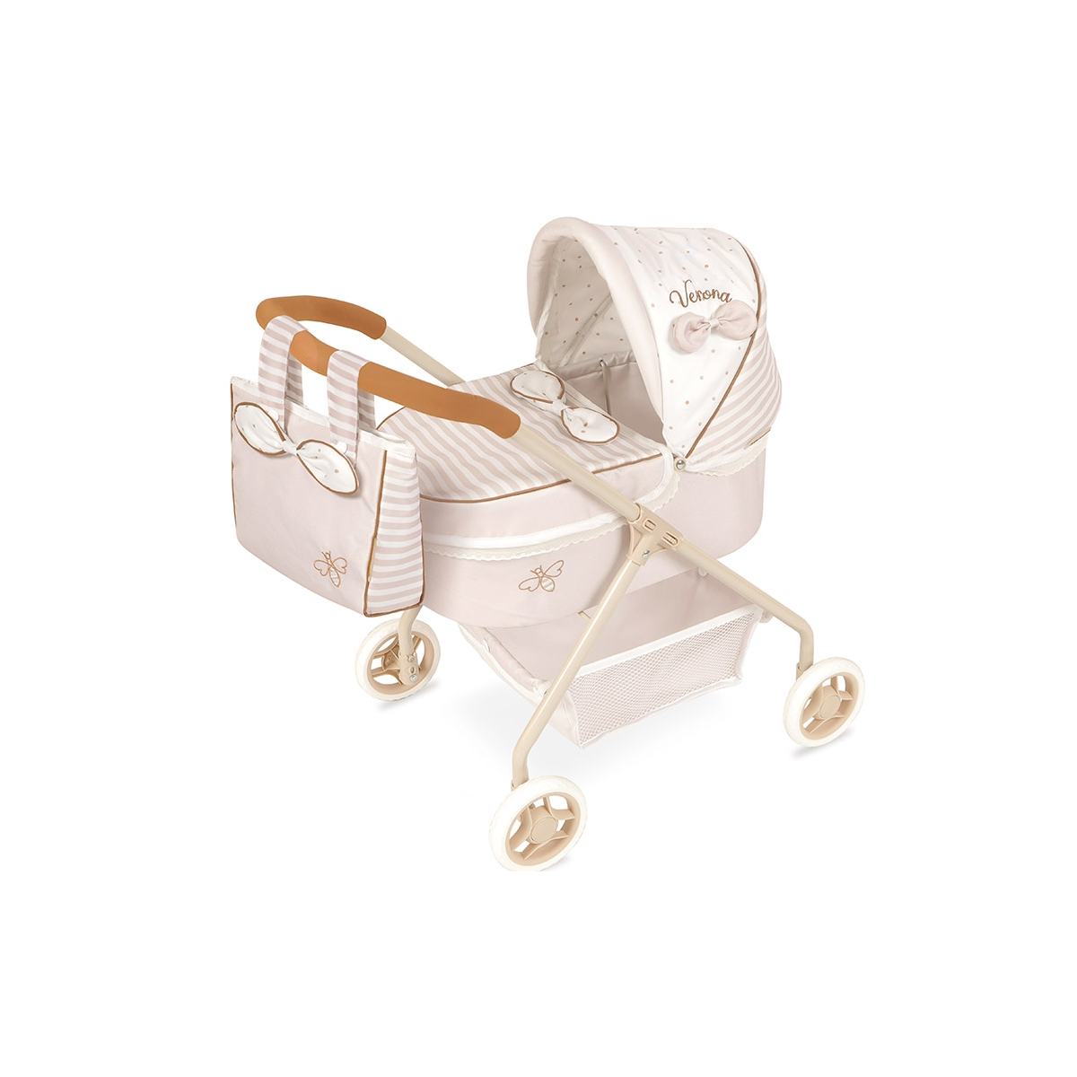 Con un diseño dulce, elegante y pensado para los primeros juegos simbólicos, el carro de muñecas Verona Mi Primer Coche de DeCuevas es perfecto para peques que empiezan a explorar el mundo del cuidado y la imitación. Sus colores suaves en tonos crema y rosa, los bordados de abejitas y los detalles como el lazo y el estampado de lunares hacen que sea irresistible a la vista, ideal para juegos en casa o paseos.