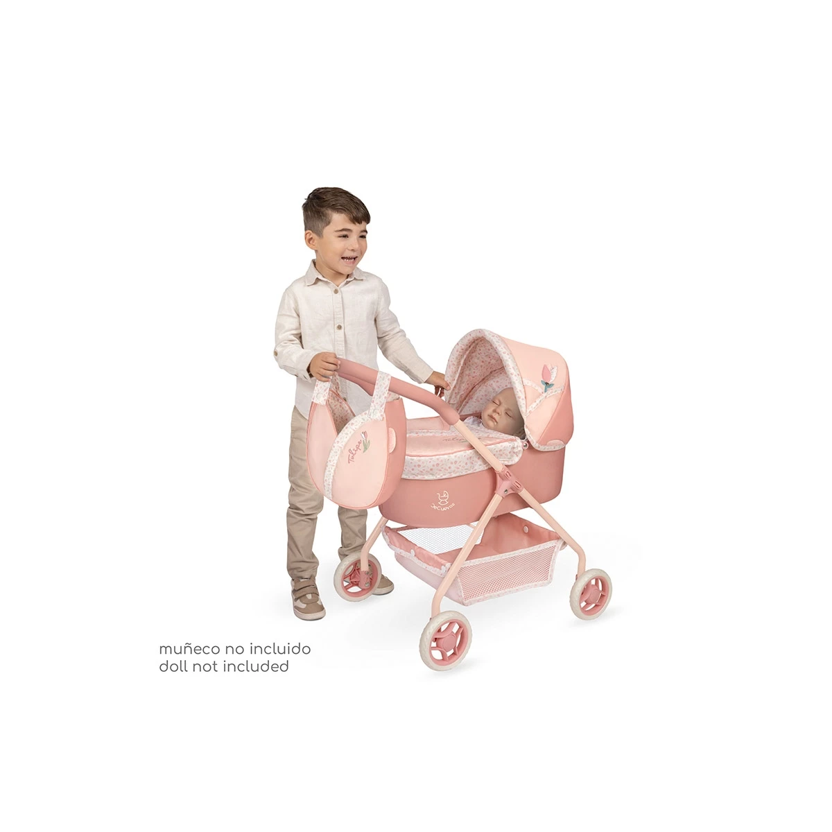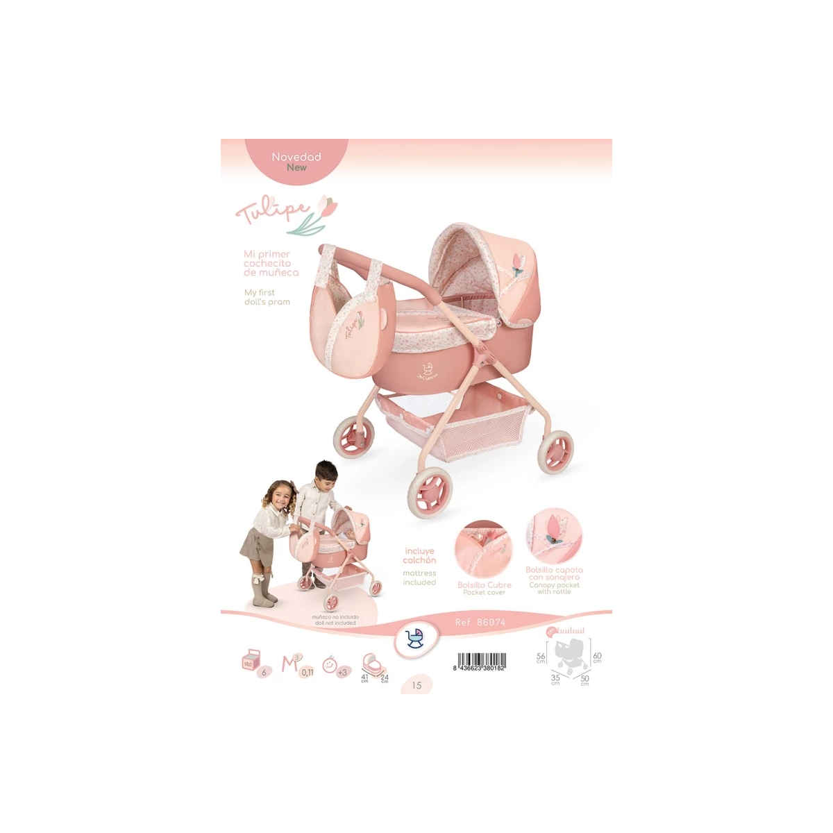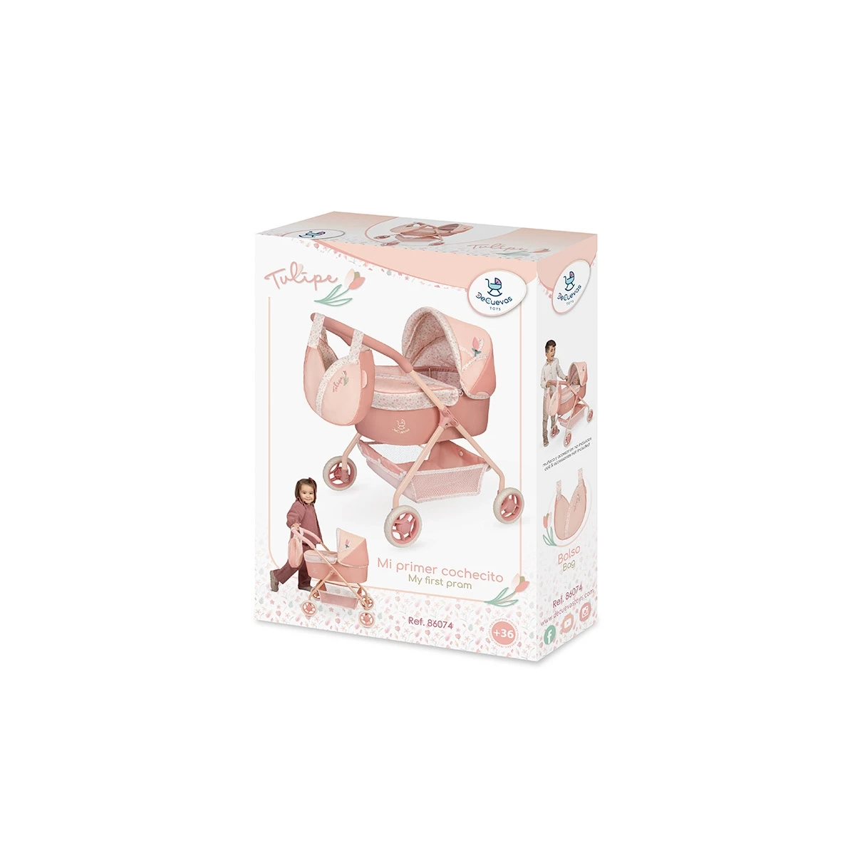 Incluye un bolso a juego que se cuelga en el manillar, ideal para llevar accesorios y completar la experiencia de juego. Además, cuenta con detalles encantadores como bolsillos decorativos y un pequeño sonajero en forma de tulipán en la capota. Su colchón interior asegura que la muñeca esté siempre cómoda y bien sujeta.
