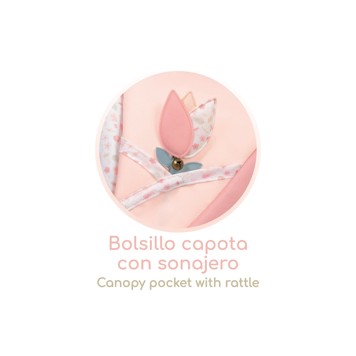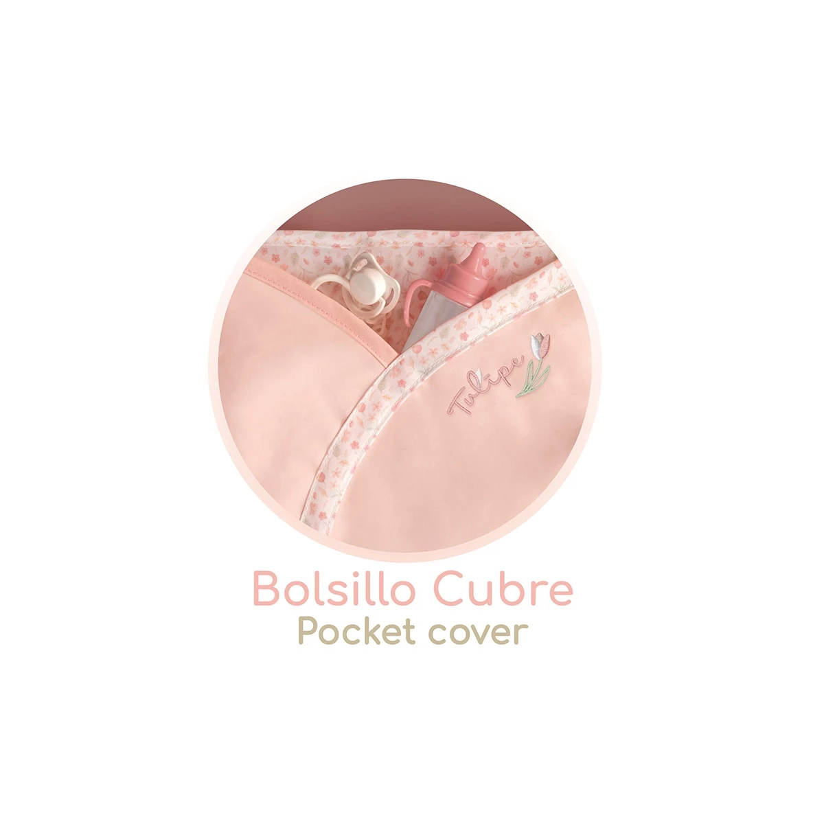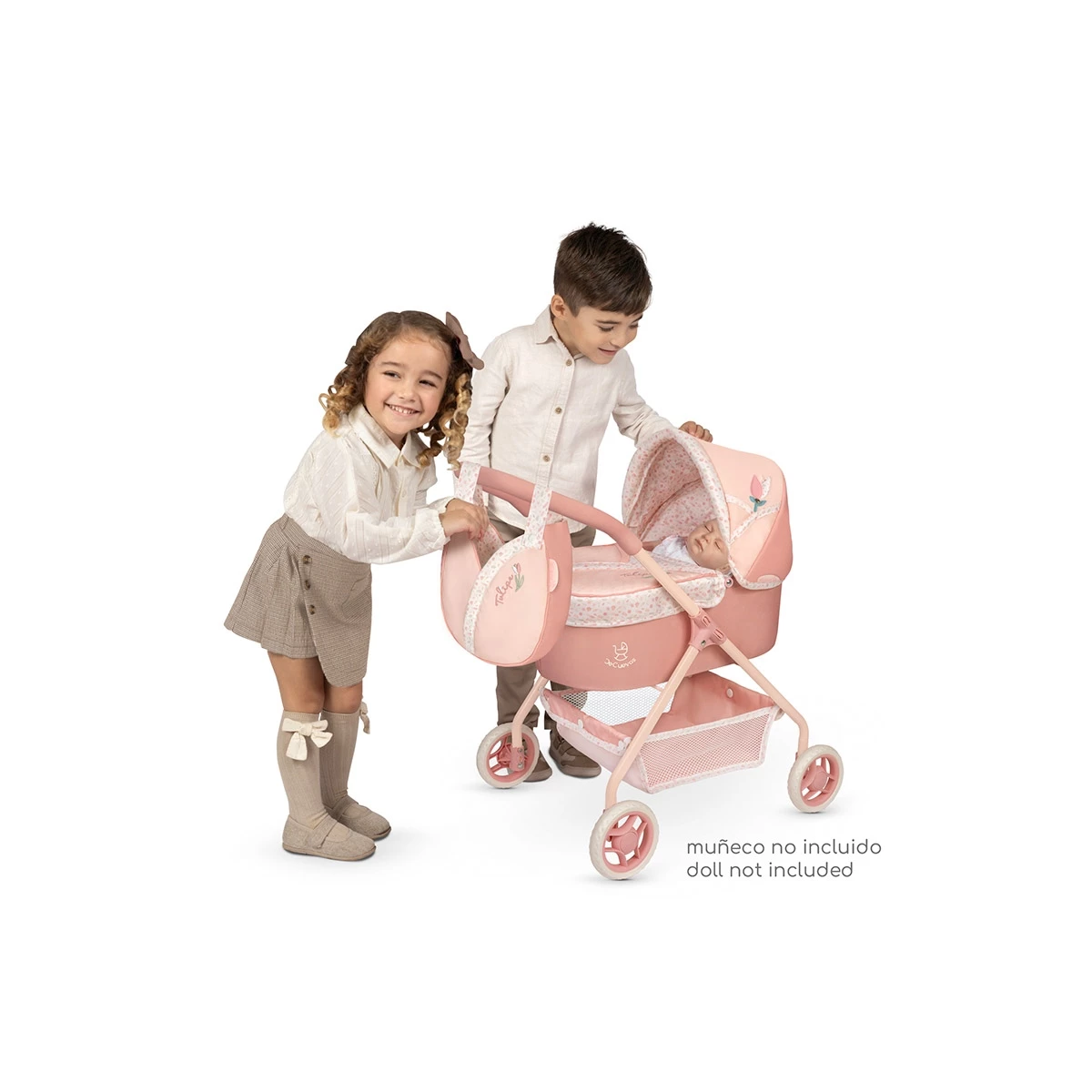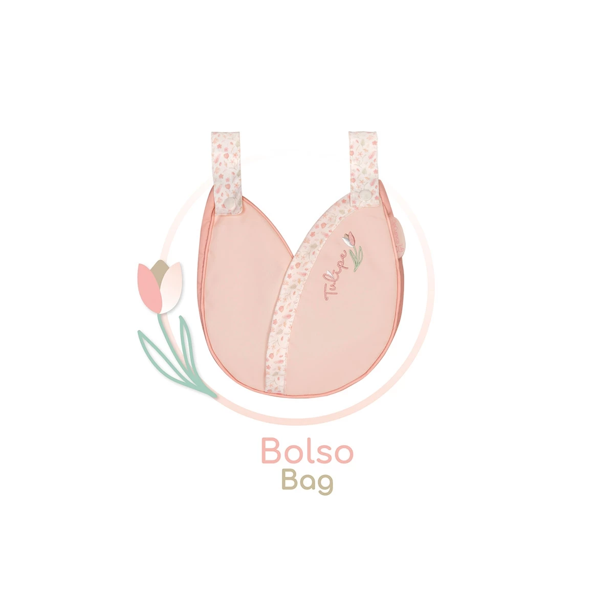 Incluye un bolso a juego que se cuelga en el manillar, ideal para llevar accesorios y completar la experiencia de juego. Además, cuenta con detalles encantadores como bolsillos decorativos y un pequeño sonajero en forma de tulipán en la capota. Su colchón interior asegura que la muñeca esté siempre cómoda y bien sujeta.