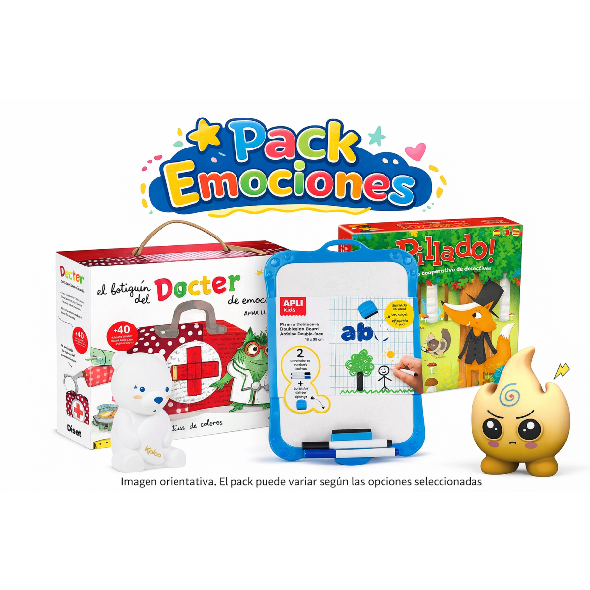 El Pack Emociones está pensado para acompañar a niños y niñas en el descubrimiento, comprensión y gestión de sus emociones a través del juego. Una selección de productos diseñada para ayudarles a identificar cómo se sienten, expresarlo de forma natural y aprender a calmarse en momentos de intensidad.