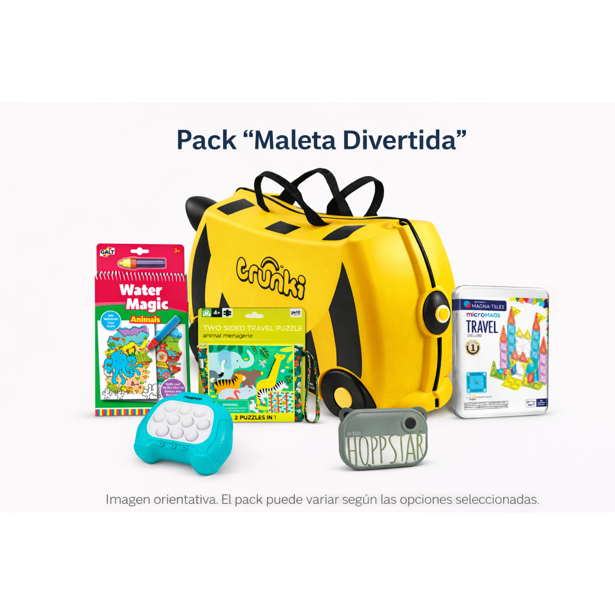 El pack incluye distintas categorías de productos que pueden combinarse según las preferencias de cada familia. Entre las opciones disponibles se pueden encontrar juegos portátiles, actividades creativas, juguetes compactos o pequeños dispositivos pensados para el entretenimiento durante los desplazamientos, además de una maleta infantil para transportar todo cómodamente.