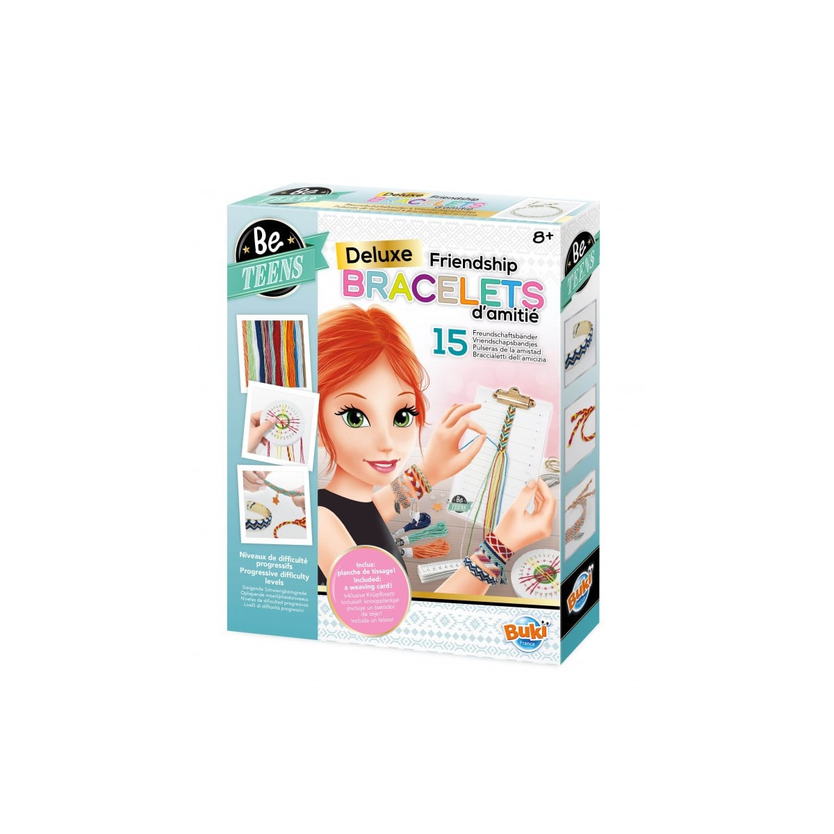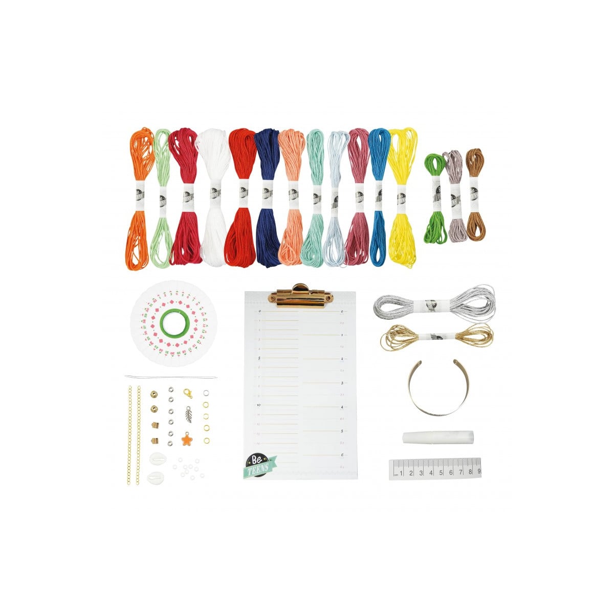 - Incluye: 1 set de pulseras de la amistad deluxe con accesorios útiles (17 hilos de colores, argollas de diferentes formas para unir las pulseras, 1 tarjeta de tejido con medidas, 1 rueda de espuma, 1 enganche para hilar, 1 metro, entre otros) y guía de instrucciones ilustrada