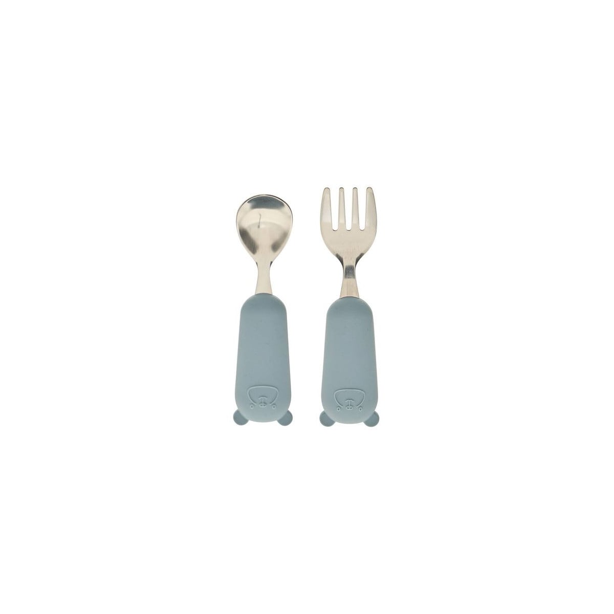 Incluye una cuchara y un tenedor fabricados en acero inoxidable, con fundas de silicona que aportan un tacto suave y un agarre cómodo. Su diseño está adaptado a manos pequeñas, facilitando el control y ayudando a mejorar la coordinación mientras aprenden a comer de manera autónoma.