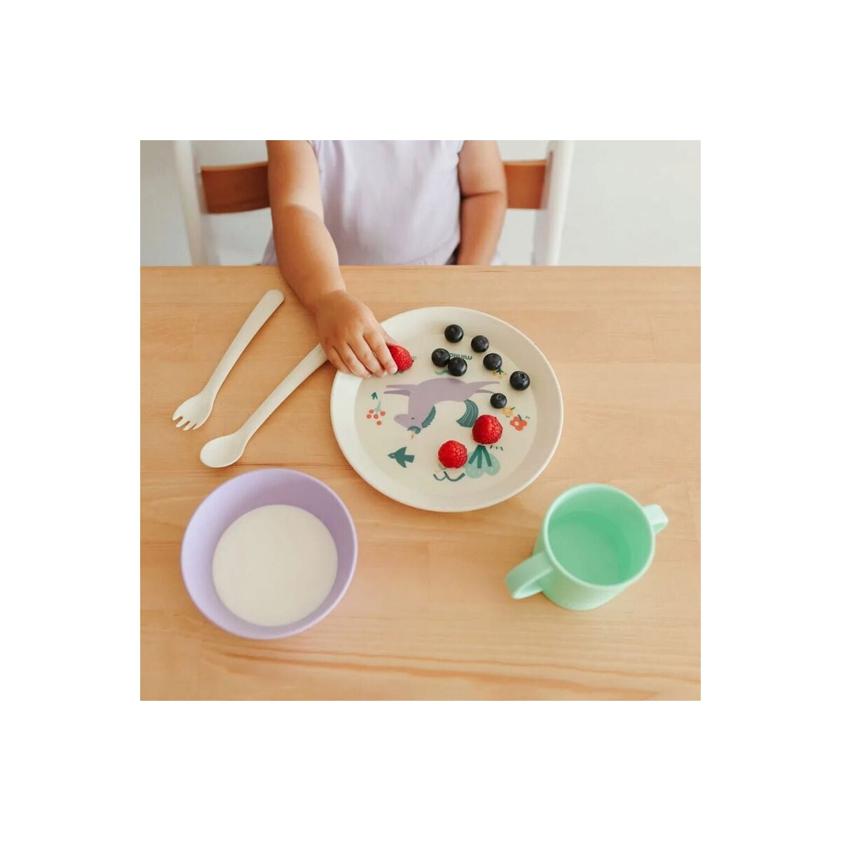 El conjunto incluye vaso con asas, cuchara, tenedor, plato y bol, todas las piezas diseñadas para facilitar el agarre y el uso independiente. Sus formas ergonómicas permiten que los pequeños puedan manipular cada elemento con mayor facilidad mientras practican a beber, pinchar o recoger alimentos con la cuchara.