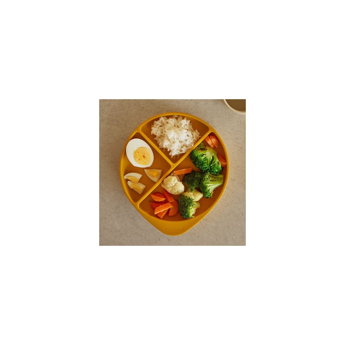 Vajilla BLW de silicona Miniland con plato antideslizante y babero recoge migas, ideal para fomentar la alimentación autónoma desde los 6 meses.