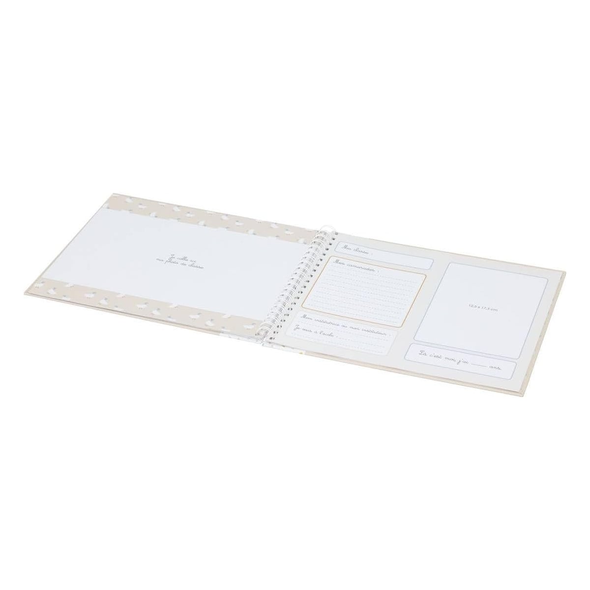 Este álbum está fabricado en papel y cartón, con un diseño resistente y pensado para durar en el tiempo. Su tamaño amplio permite ver bien cada fotografía y escribir cómodamente, convirtiéndolo en un recuerdo completo y muy especial.