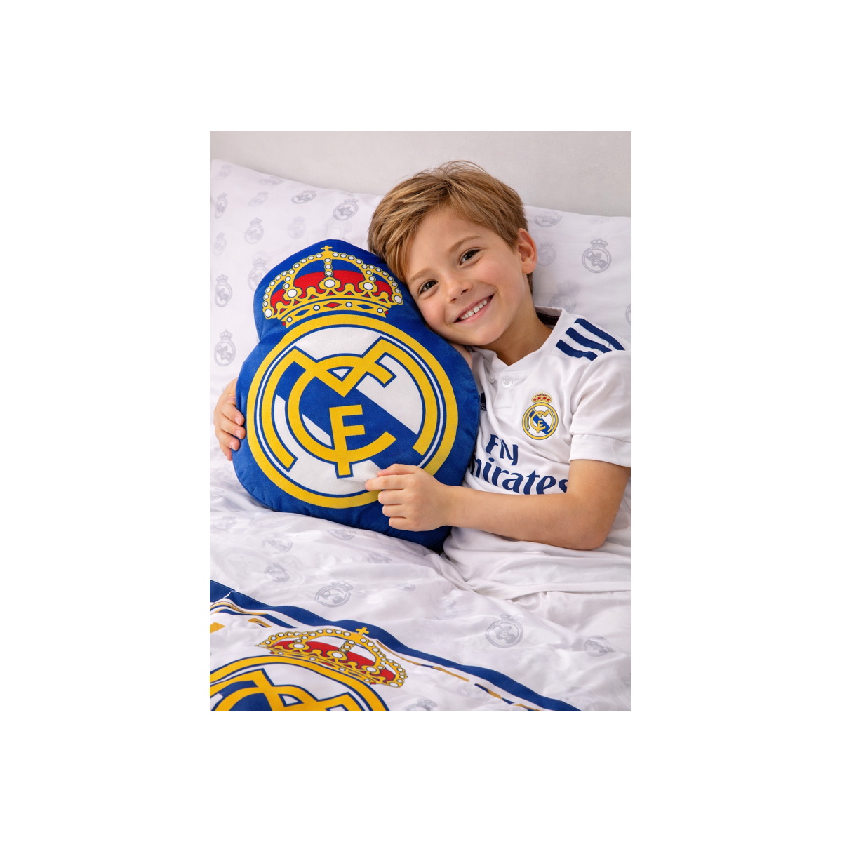 El Cojín Real Madrid Escudo es una pieza perfecta para niños y niñas fans del equipo blanco que quieren dar un toque futbolero a su habitación o zona de descanso. Su diseño con forma del escudo del Real Madrid lo convierte en un cojín original y muy llamativo, ideal para destacar en cualquier espacio.