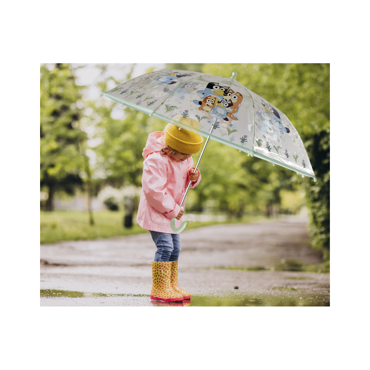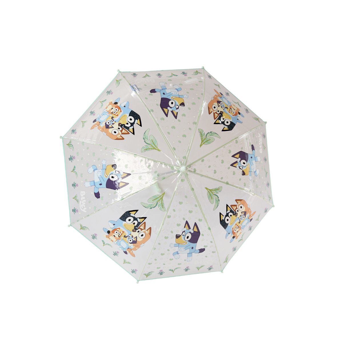 - Diseño: Paraguas plegable de 8 paneles con mango. Material transparente para mayor visibilidad del entorno aumentando la seguridad. Con diseño de Bluey.