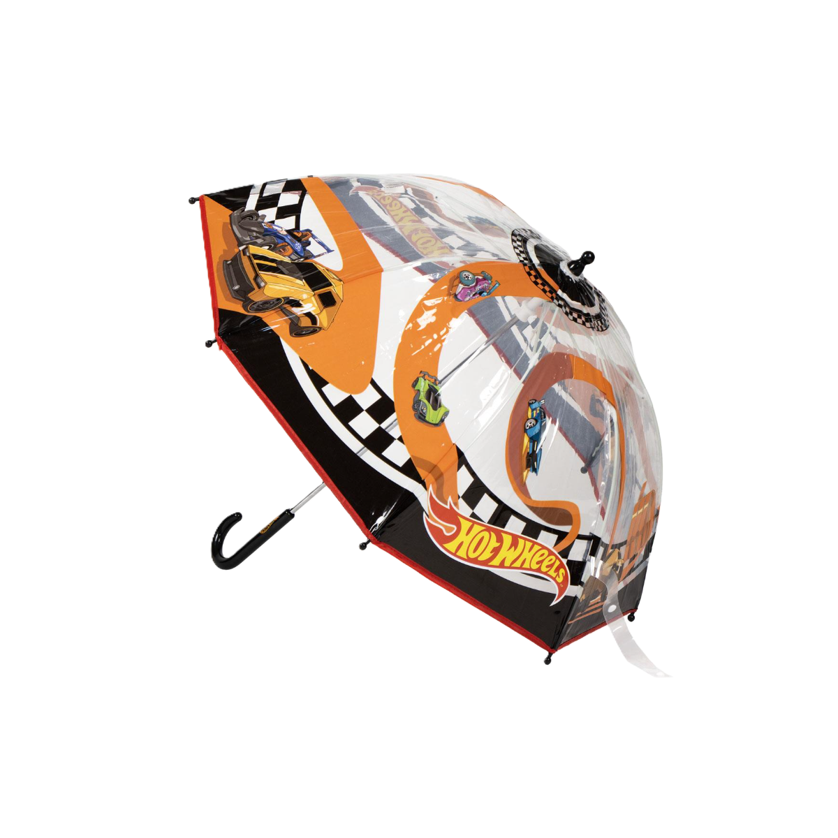 - Diseño: Paraguas plegable de 8 paneles con mango. Material transparente para mayor visibilidad del entorno aumentando la seguridad. Con diseño de Hot Wheels.