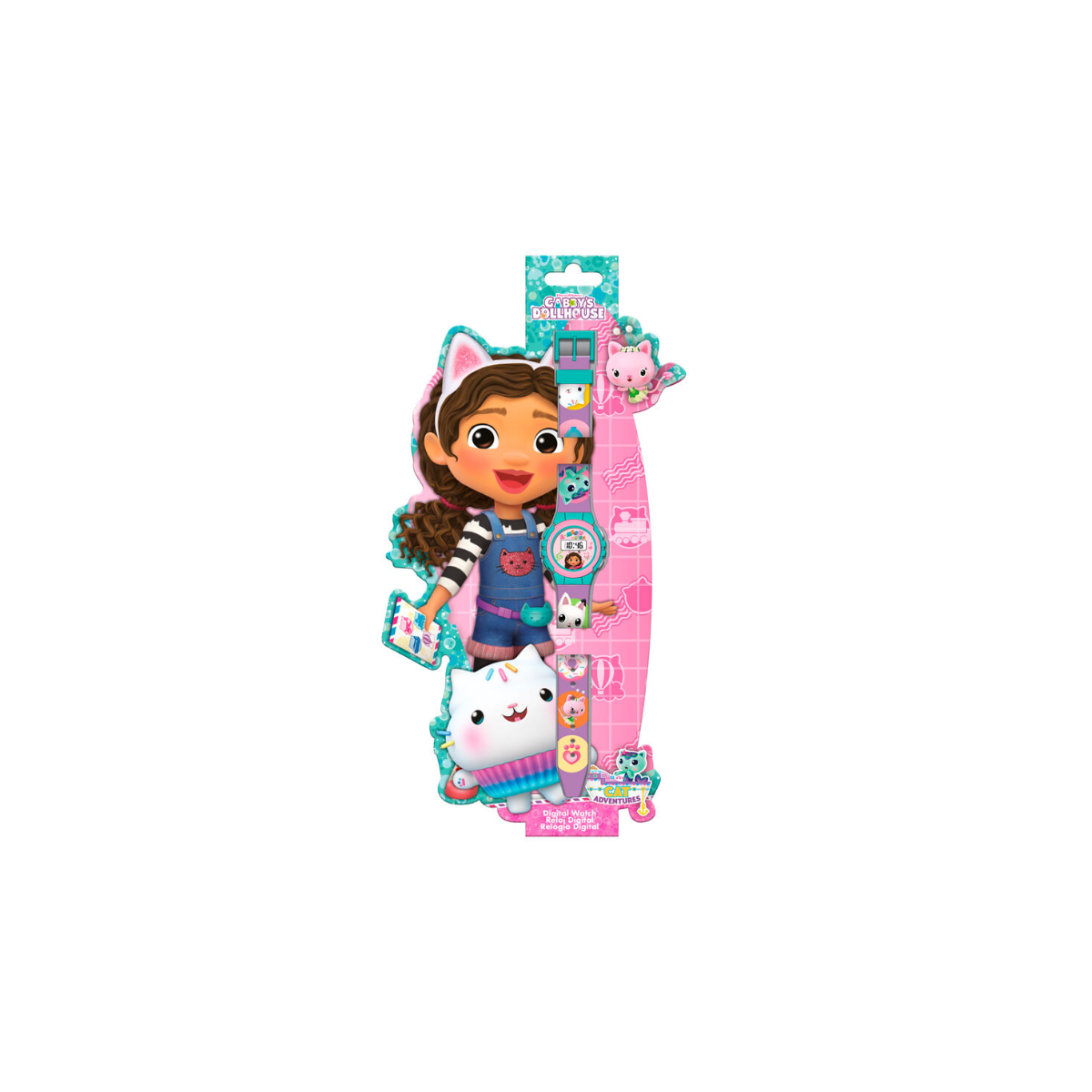 Aprende las horas digitales con el Reloj Electrónico de La Casa de Muñecas de Gabby y adorna tu muñeca con su colorido estampado de tus personajes favoritos de la serie.