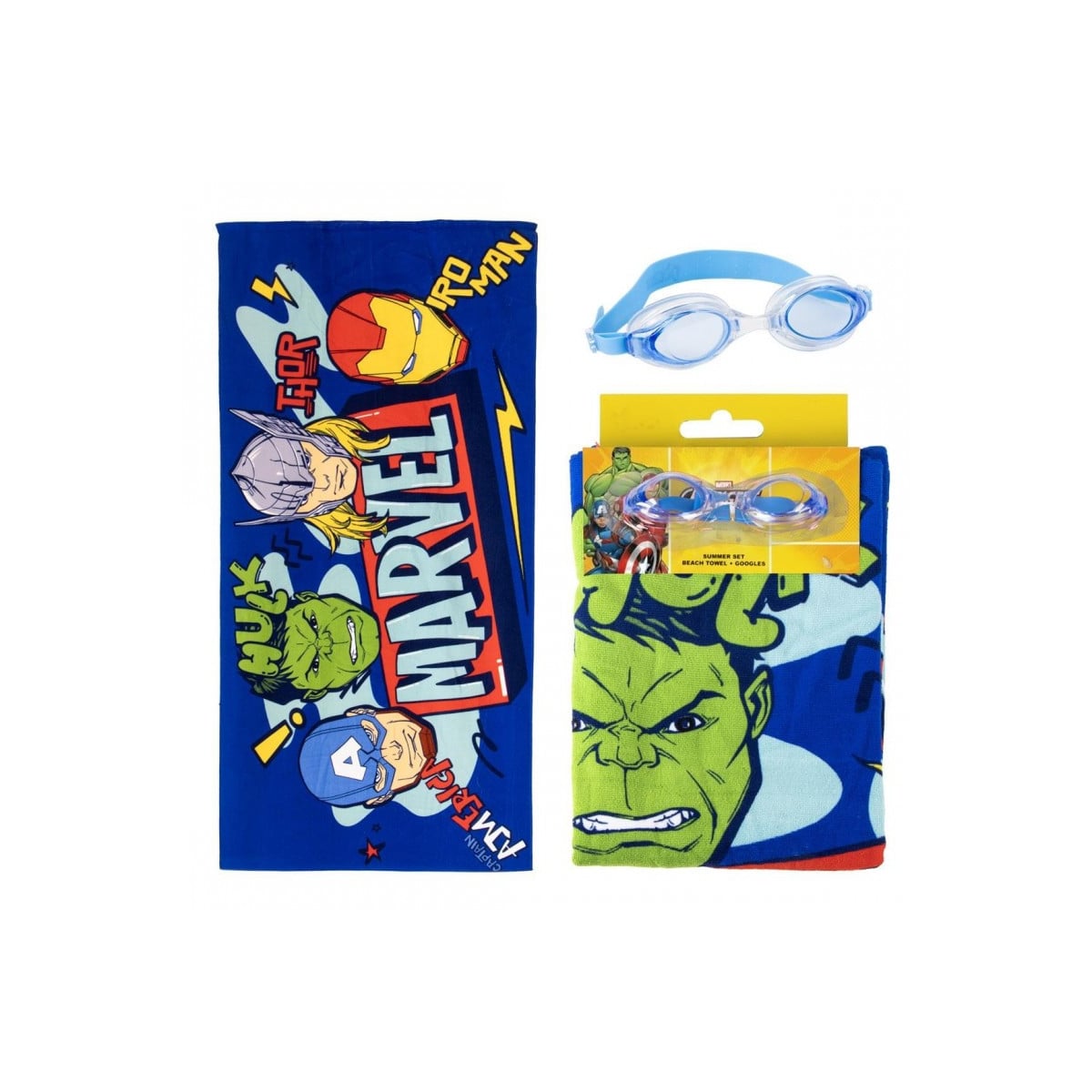 Set Avengers con toalla 70x140 cm y gafas de natación ajustables. Ideal para niños y niñas fans de Marvel en playa o piscina.