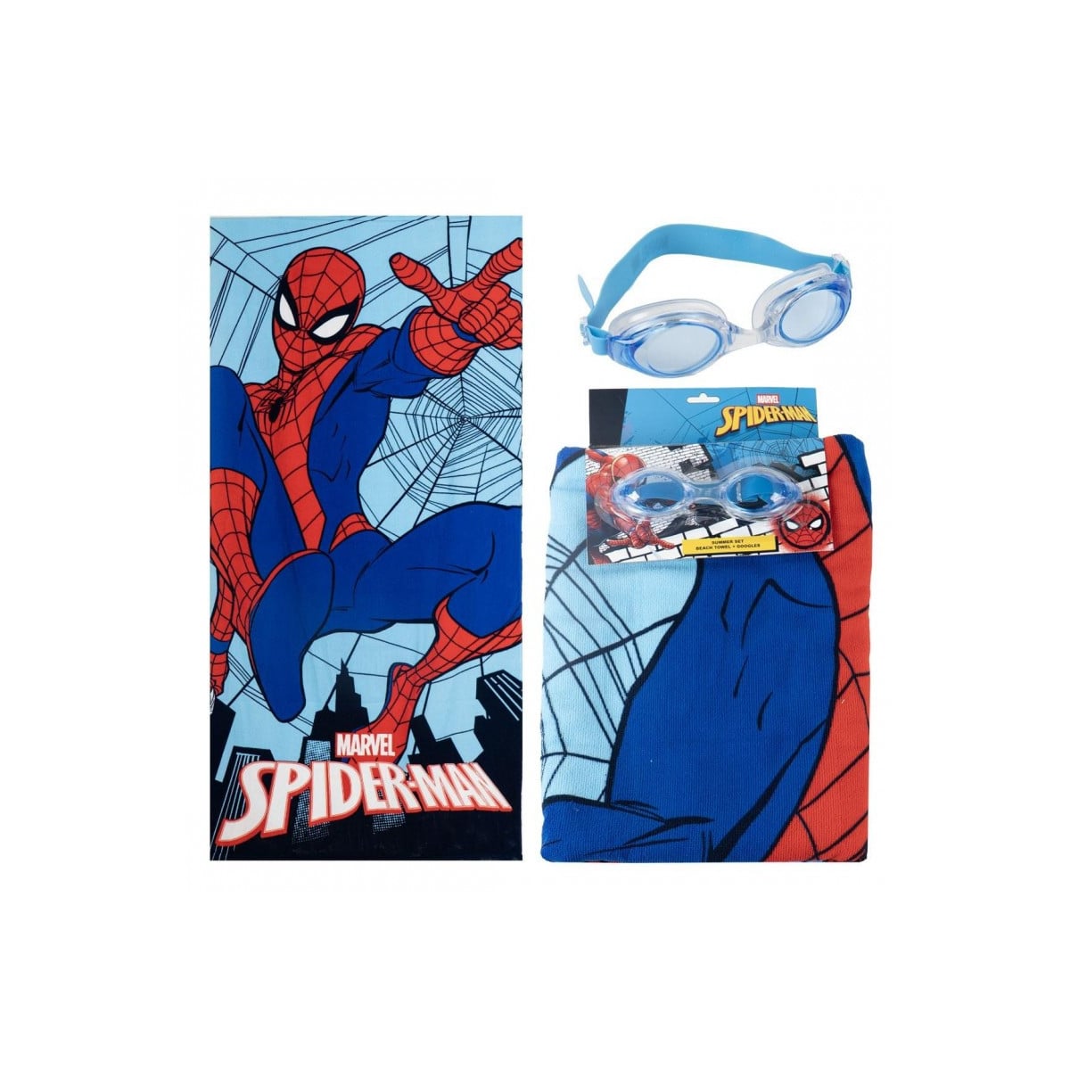 Set Spiderman con toalla 70x140 cm y gafas ajustables. Ideal para niños y niñas fans de Marvel en piscina o playa.