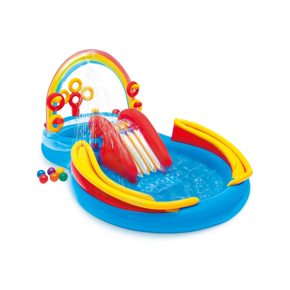 - Incluye: tobogán inflable con rampa acolchada, 2 piscinas, fuente de agua, 4 aros inflables, 6 pelotas
