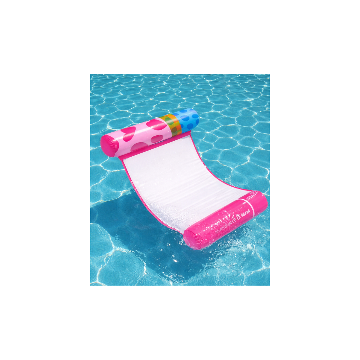 Con un diseño alegre en tonos rosas y detalles característicos de la marca, este flotador destaca por su estilo divertido y veraniego. Es perfecto para usar en piscina o playa, ofreciendo una experiencia más cómoda que los flotadores tradicionales gracias a su formato tipo asiento suspendido.