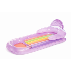- Diseño: Colchoneta tipo tumbona en tonos morados y translúcidos con detalles de color, con respaldo incorporado para una posición más cómoda y relajada.