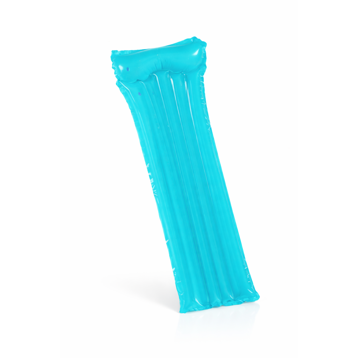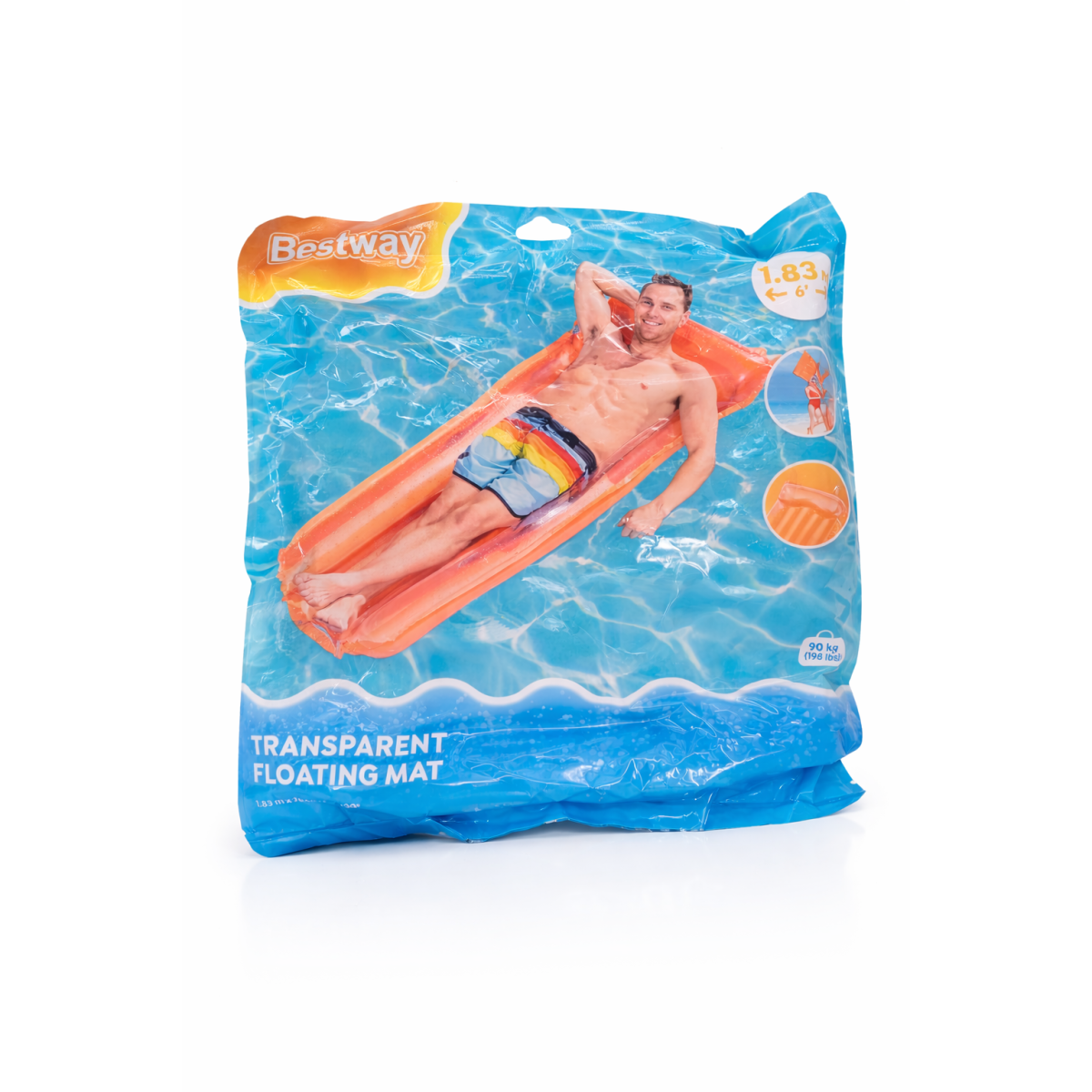 - Diseño: Colchoneta hinchable transparente disponible en colores surtidos (azul, naranja, rosa y gris), con acabado llamativo y veraniego.