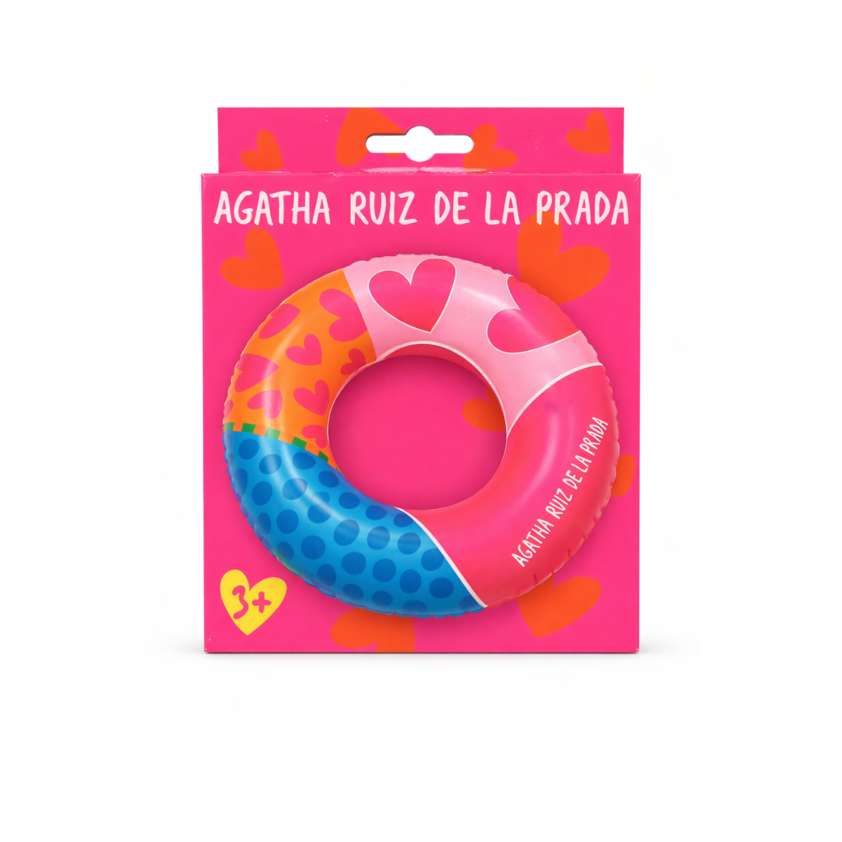 Con el inconfundible estilo de Agatha Ruiz de la Prada, este flotador destaca por su combinación de colores vivos y estampados de corazones, creando un diseño muy llamativo y divertido. Su estética original lo convierte en un accesorio que encanta a los niños y niñas, aportando un toque único a cada baño.