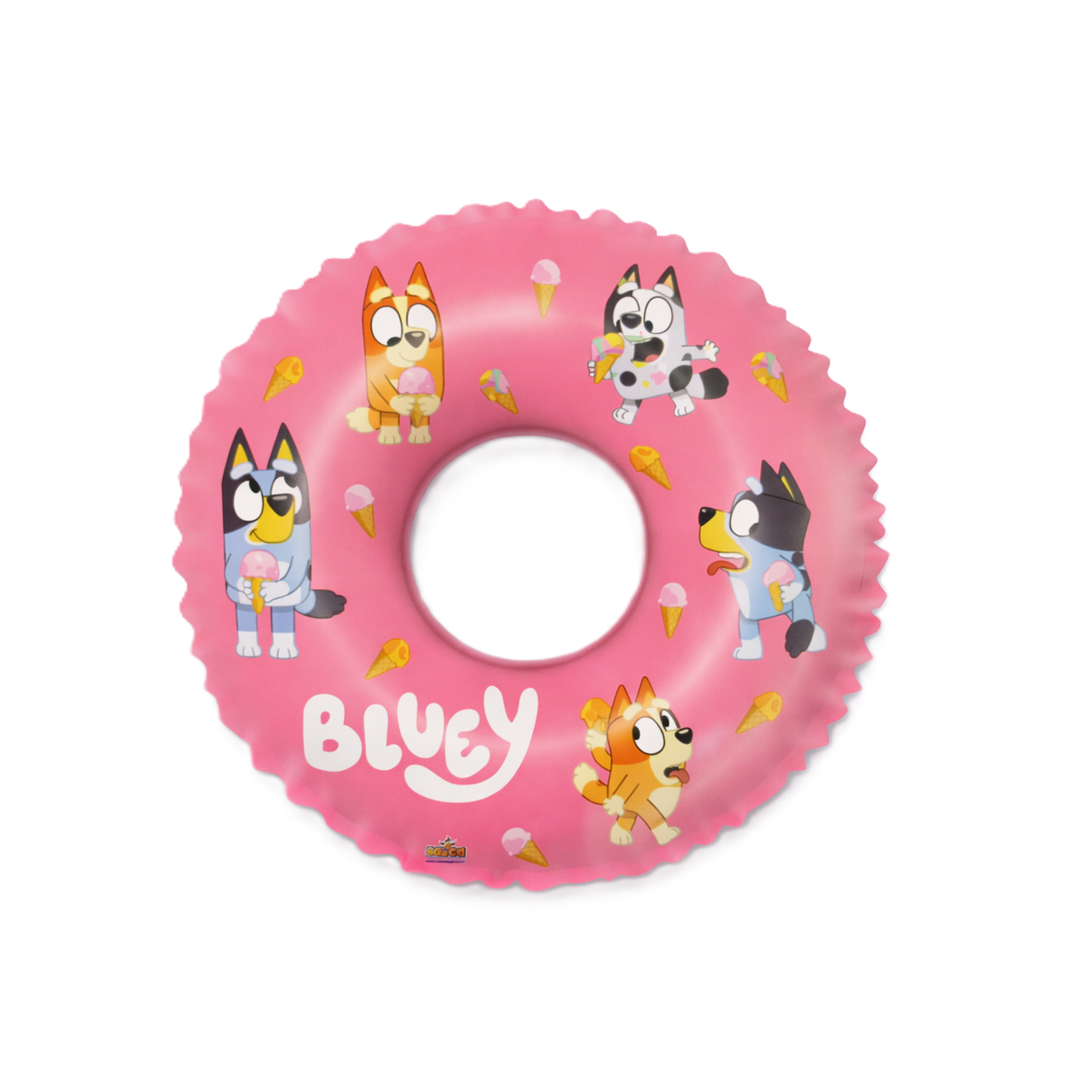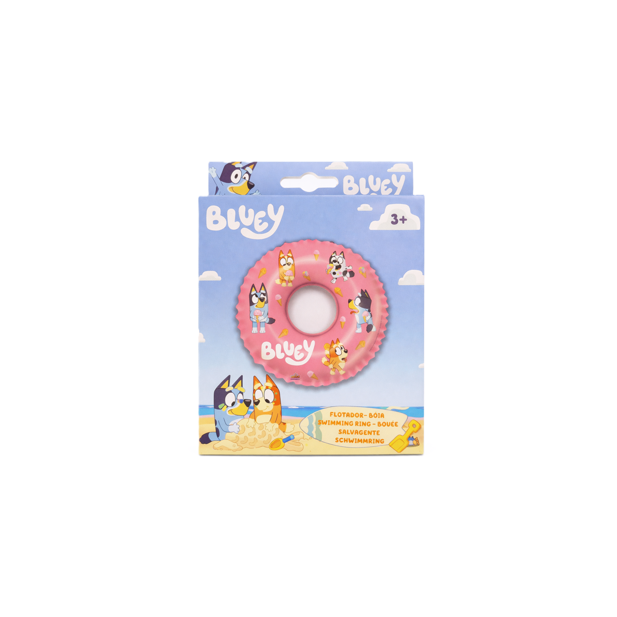 Inspirado en la popular serie Bluey, este flotador destaca por su bonito color rosa decorado con ilustraciones de los personajes y detalles veraniegos como helados. Su tamaño es ideal para que niños y niñas se sientan cómodos dentro del agua, ya sea en la piscina o en la playa, mientras juegan y se familiarizan con el entorno acuático.