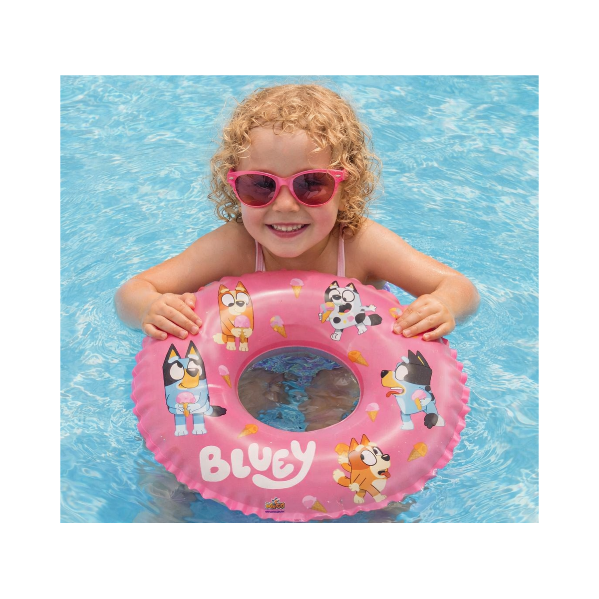 - Diseño: Flotador infantil con diseño de Bluey en color rosa, decorado con personajes y detalles divertidos que encantan a los más pequeños.