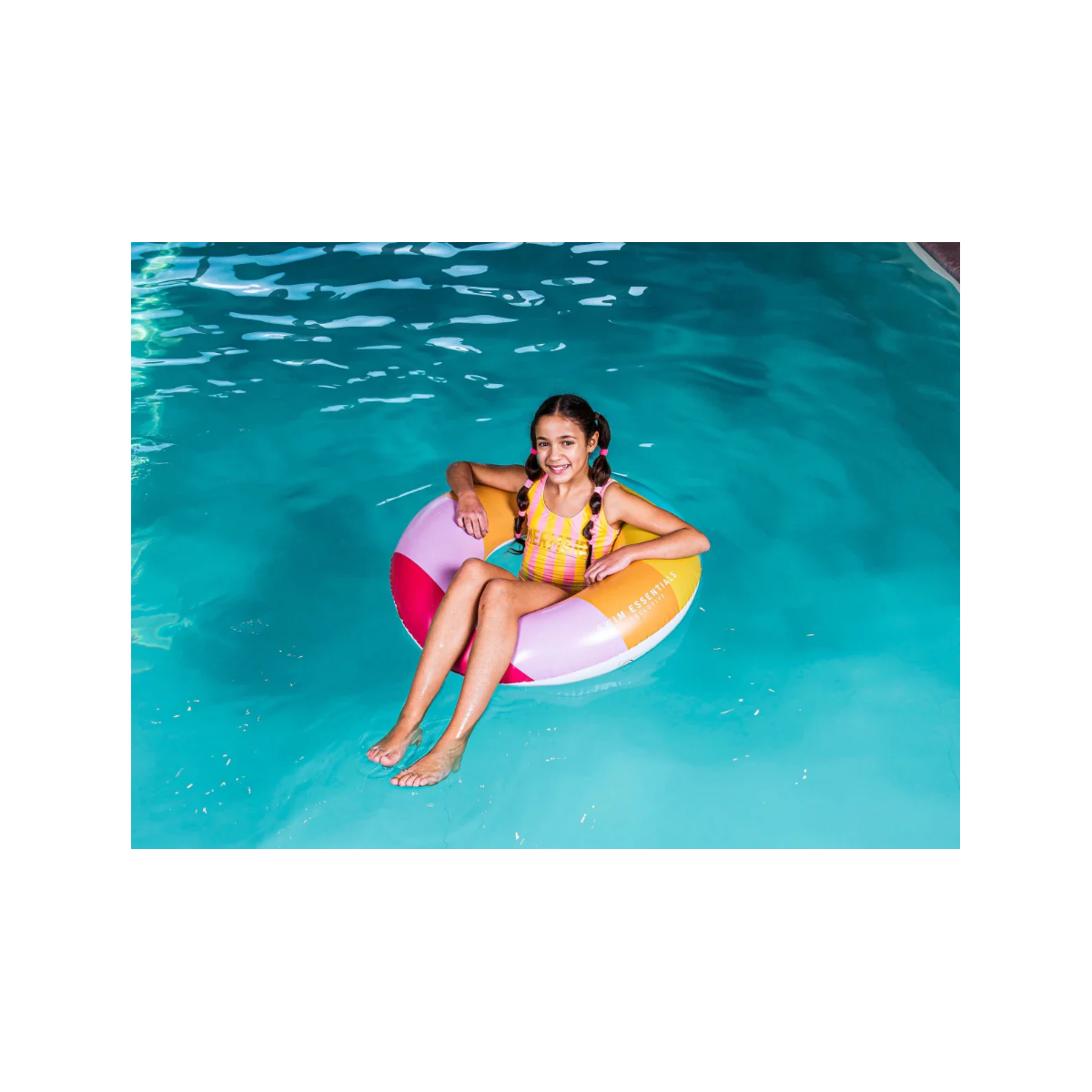Flotador redondo multicolor de 90 cm, cómodo y resistente. Perfecto para niños desde 6 años que quieren disfrutar del agua en piscina o playa con estilo.