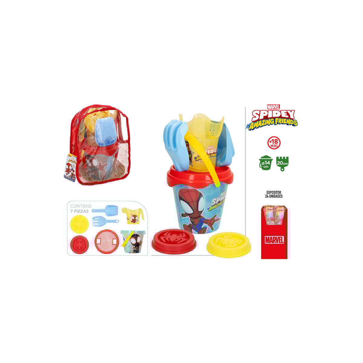 Cubo playa Spidey con accesorios y mochila, ideal para jugar en la arena y disfrutar del verano desde 18 meses.