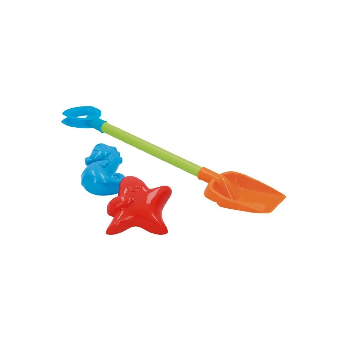 Set de pala de playa y 2 moldes, uno de caballito y otro de estrella de mar.