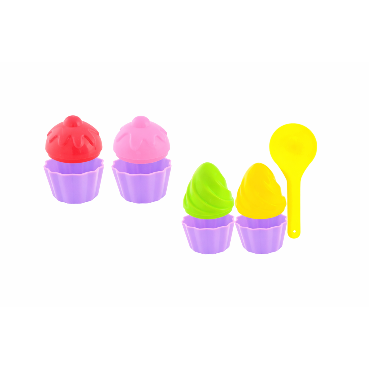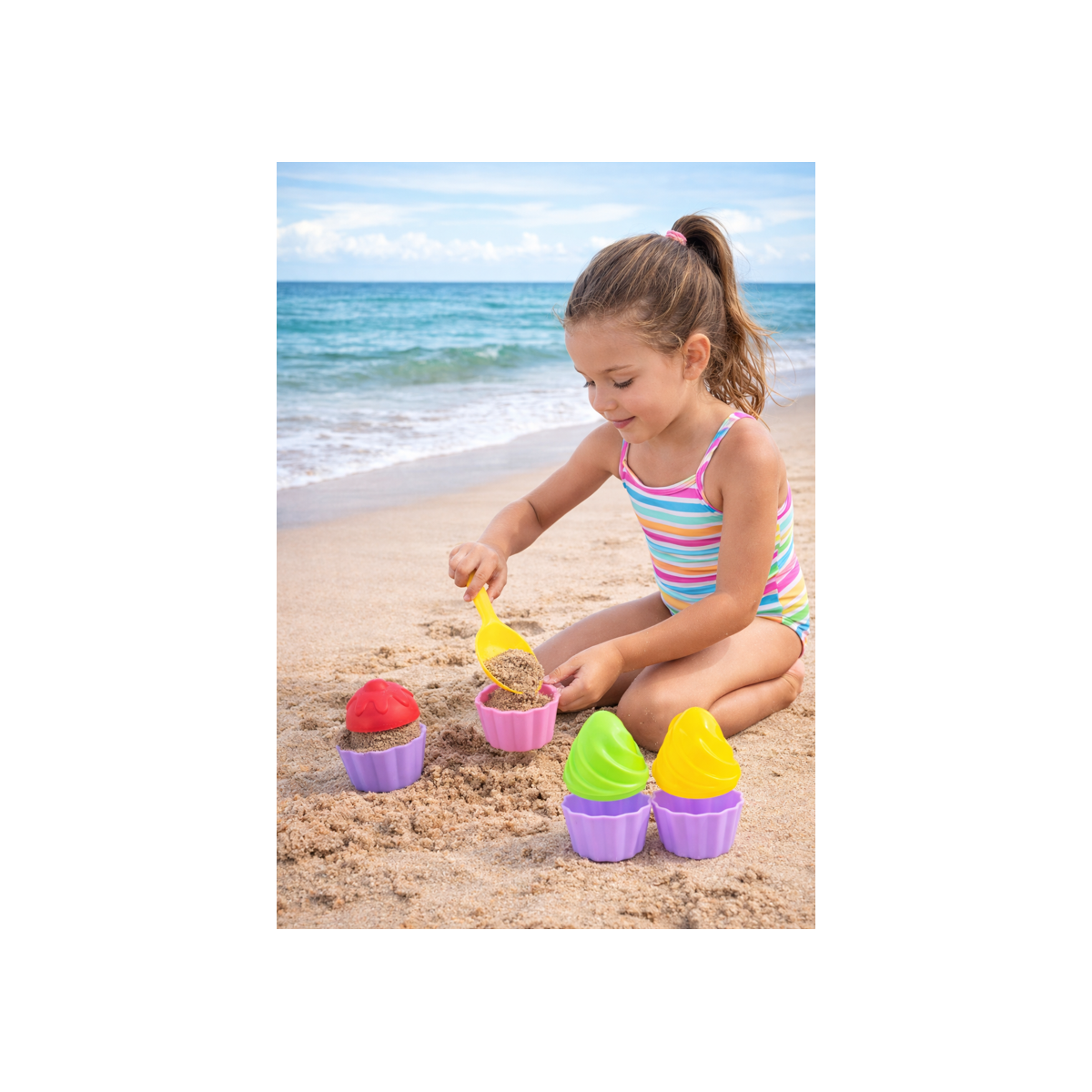 - Diseño: Set de cupcakes de colores llamativos, perfecto para crear divertidas formas en la arena y fomentar el juego creativo.