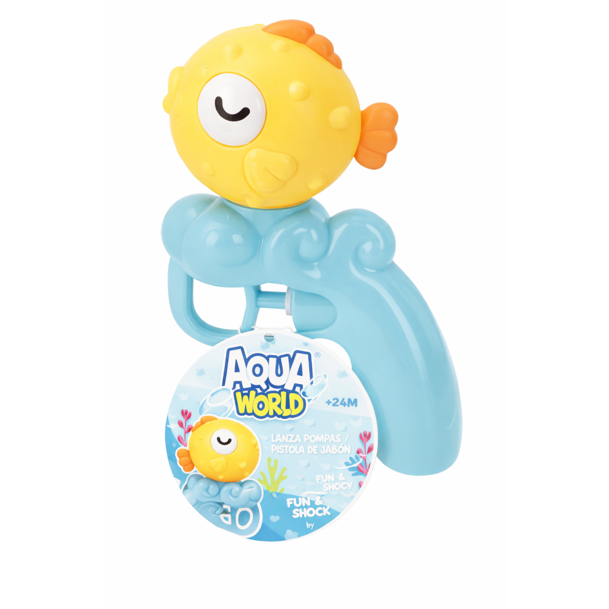 Pistola de agua Aqua World con diseño de pececitos. Ideal para verano, playa o piscina. Divierte y refresca mientras desarrolla coordinación.