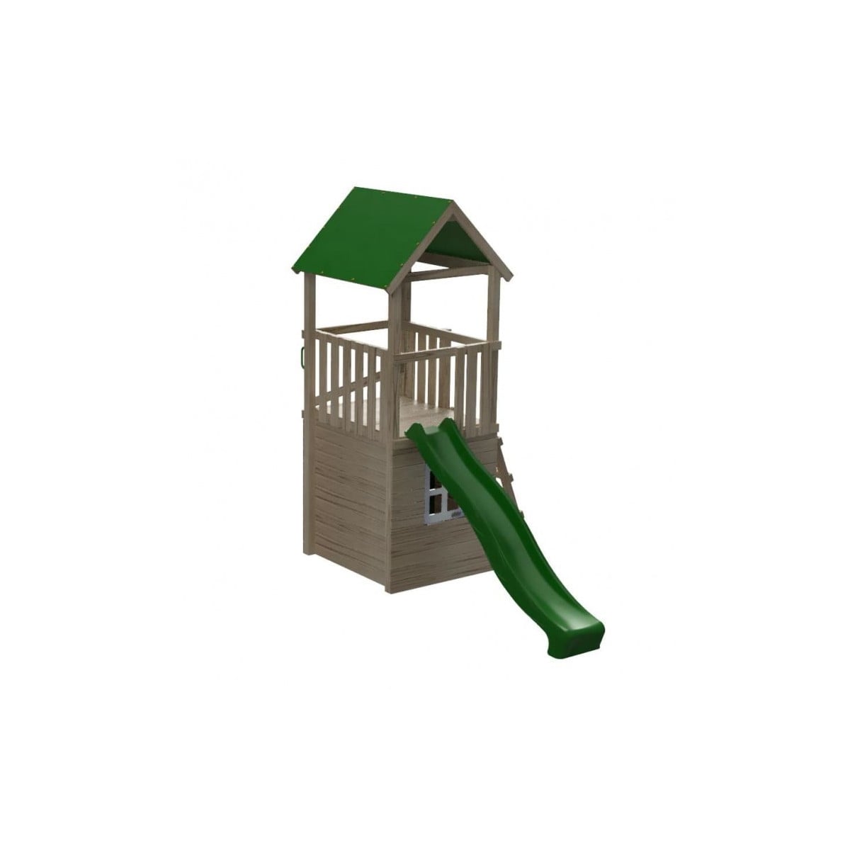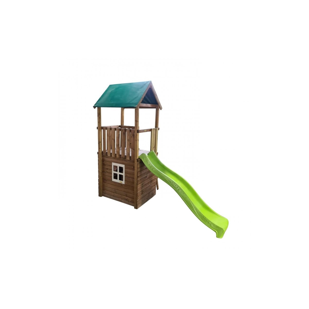 - Version con Casita: En esta version, la base se cierra para crear una encantadora casita con puerta y ventana. El acceso a la plataforma de 120 cm de altura se realiza mediante una escalera, y la bajada es por el tobogan, garantizando horas de juego y diversion.