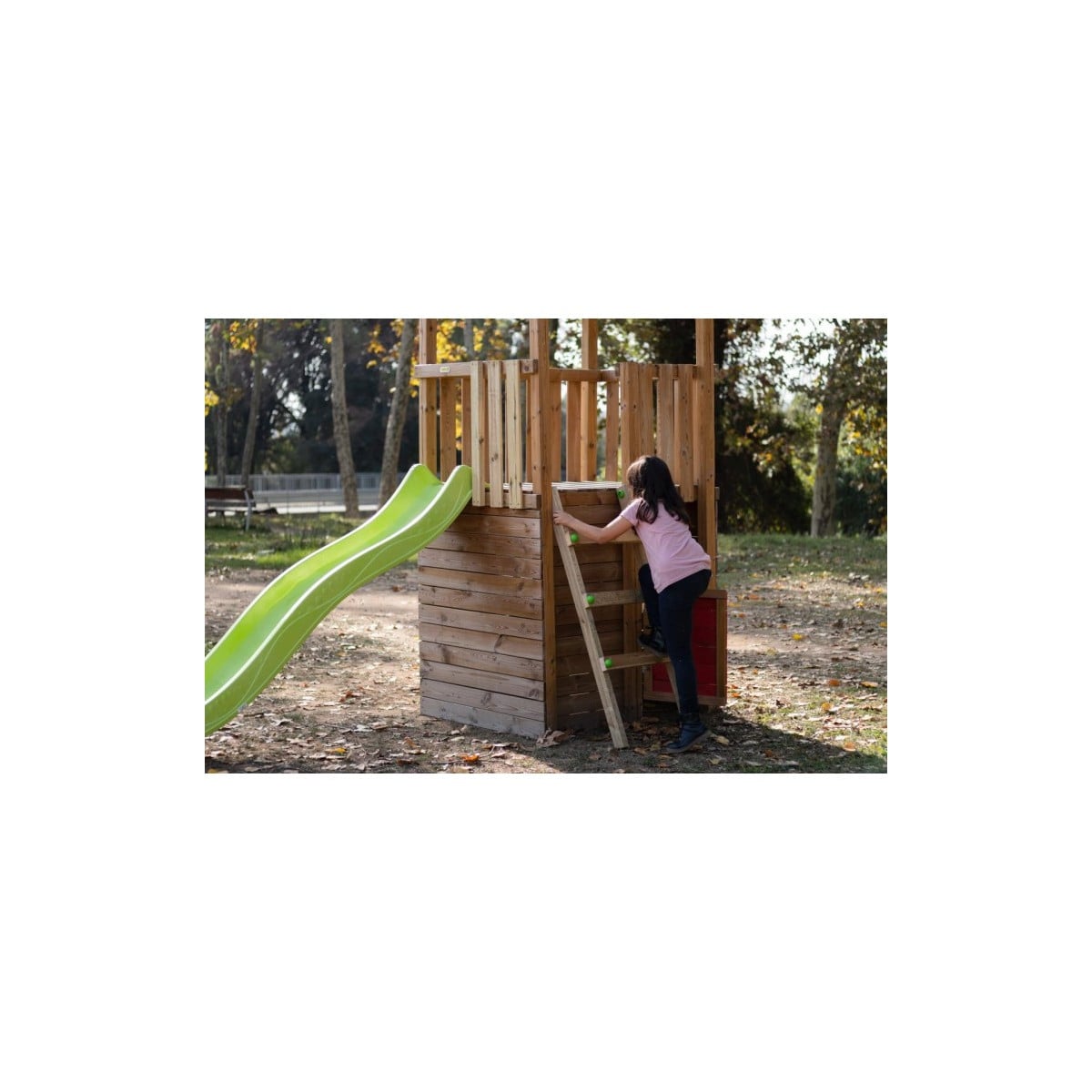 El acceso a la diversion se realiza a traves de una elegante escalera de madera que te llevara hasta el piso superior, ubicado a una altura de 120 cm. La plataforma esta protegida por una barandilla de madera que rodea todo su perimetro, a excepcion de la version con rocodromo, que tiene un lado abierto para facilitar el acceso. Pero no te preocupes, en cualquiera de las opciones, la emocionante bajada esta garantizada gracias a la divertida rampa de tobogan.
