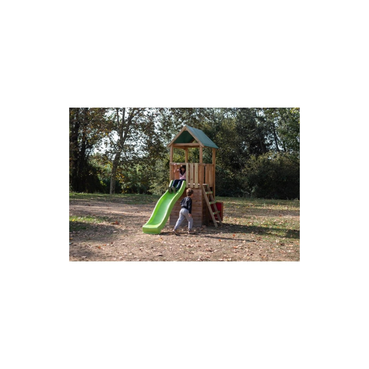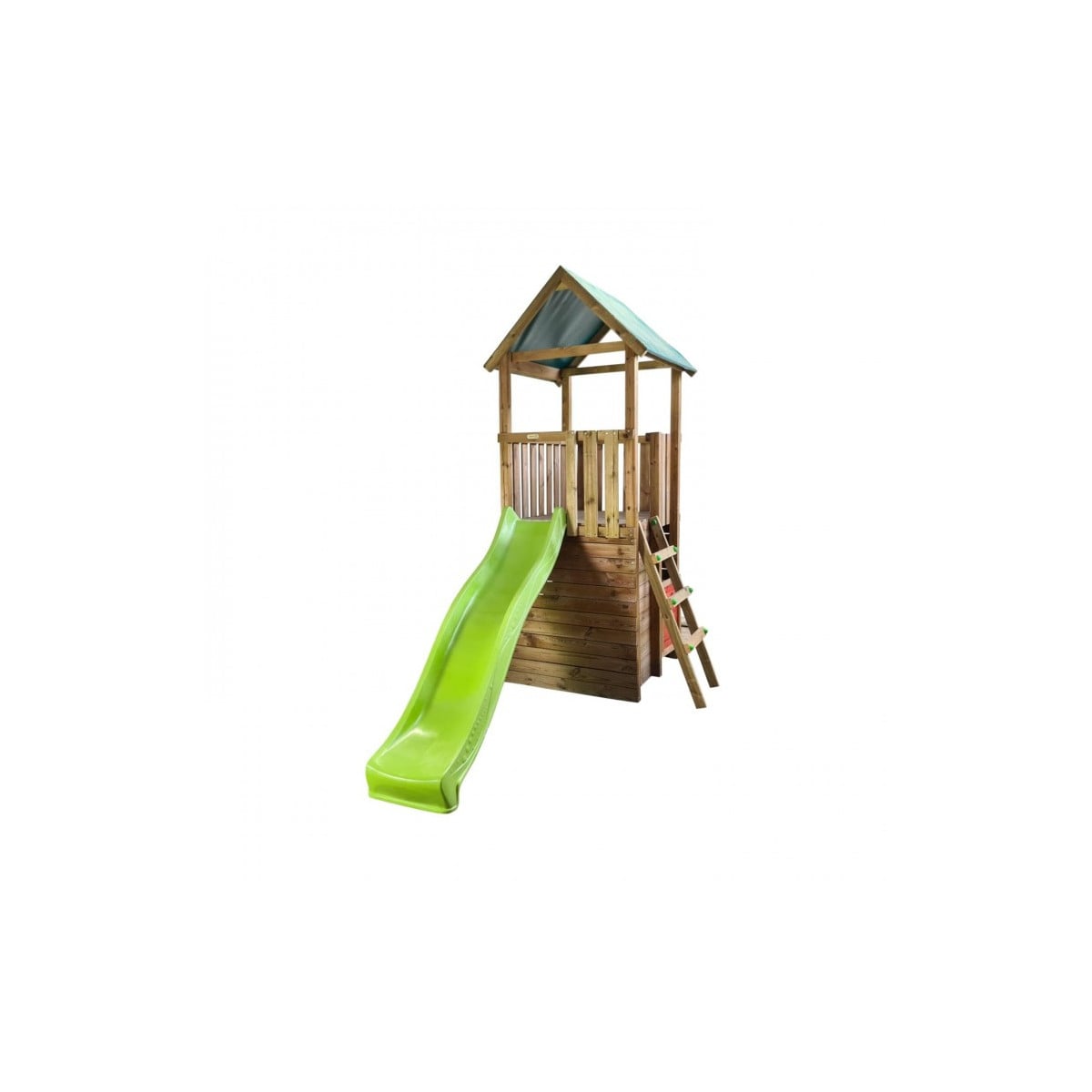 El Parque Infantil Tibidabo de Masgames se entrega con todo lo que necesitas para su montaje, incluyendo las maderas, la lona que cubre la casita, la tornilleria, una llamativa rampa de tobogan verde y los anclajes para asegurarlo en su lugar en un suelo blando de tierra o cesped.